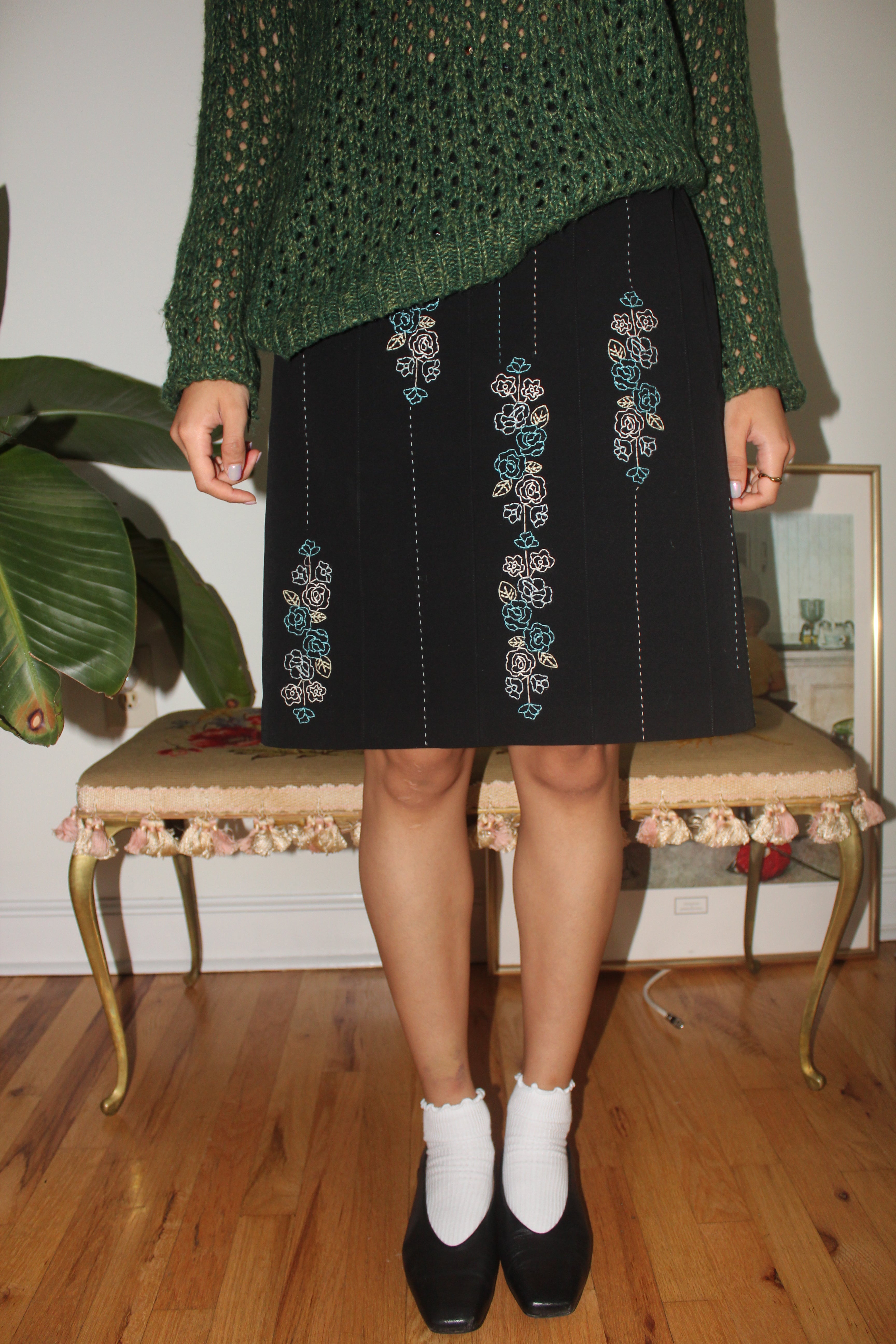 Vintage 90s Black Floral-Embroidered Skirt (M)