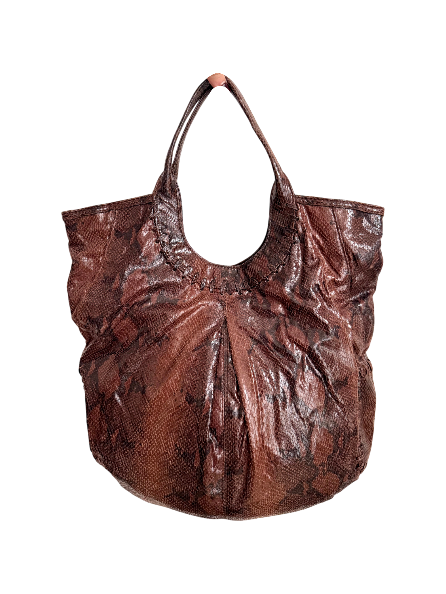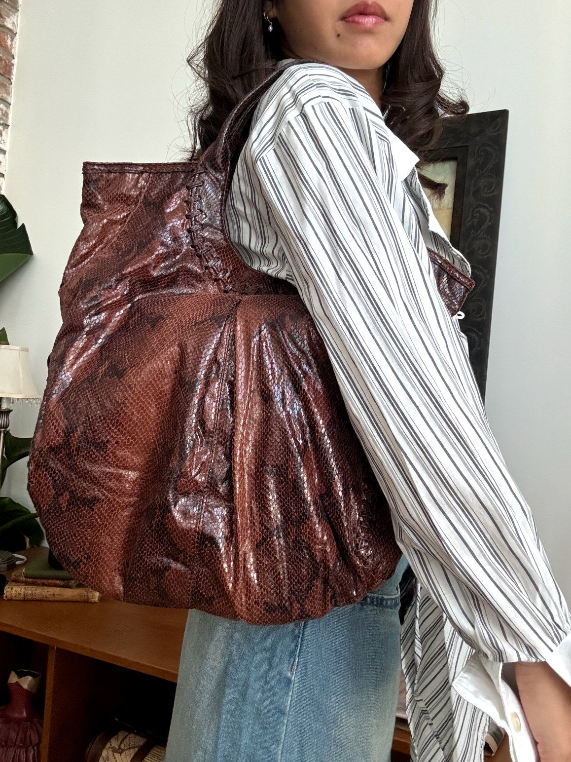 Vintage Y2K Chocolate Snakeskin Slouch Tote