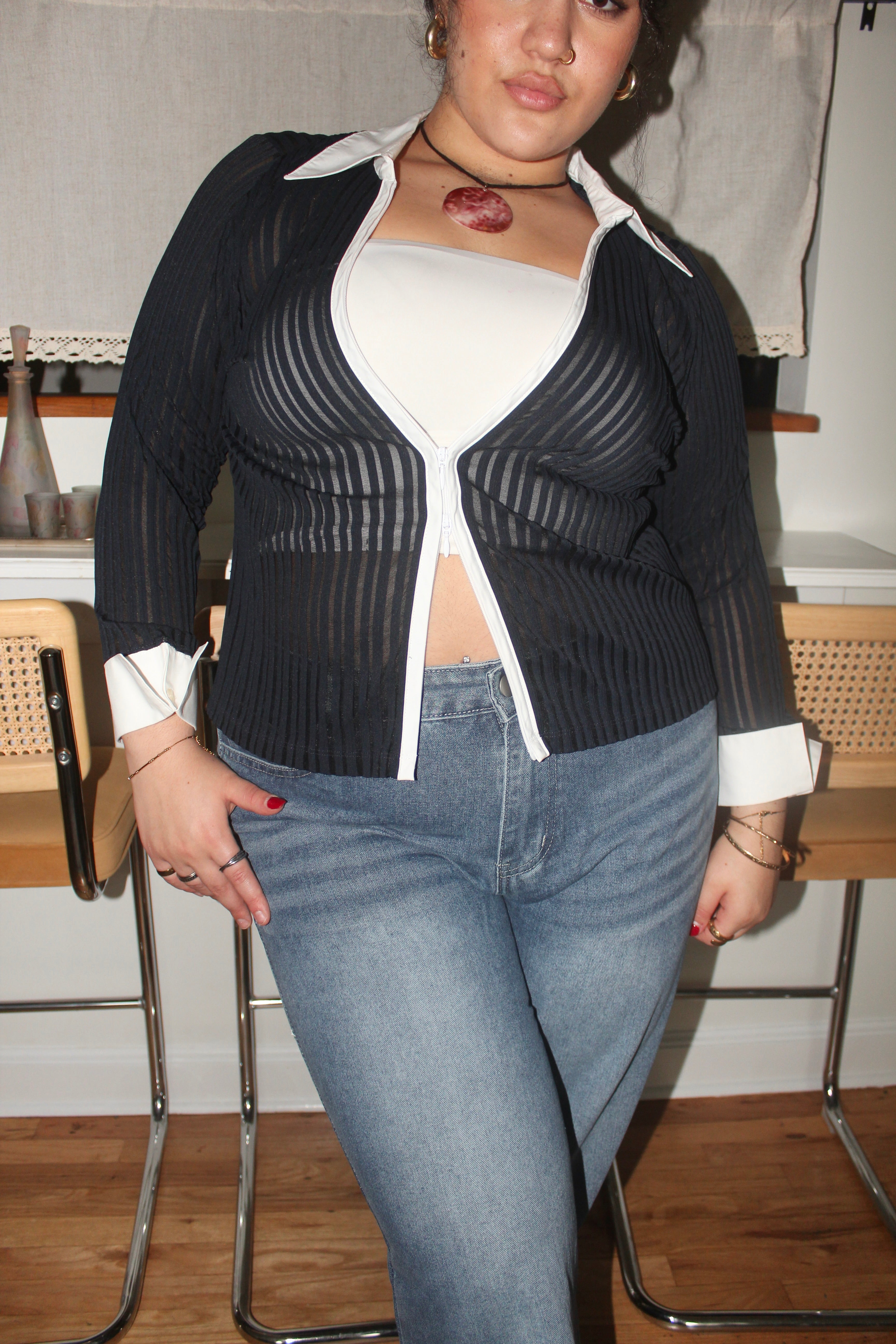 Vintage Y2K Sheer Pinstripe Zip Top (L)