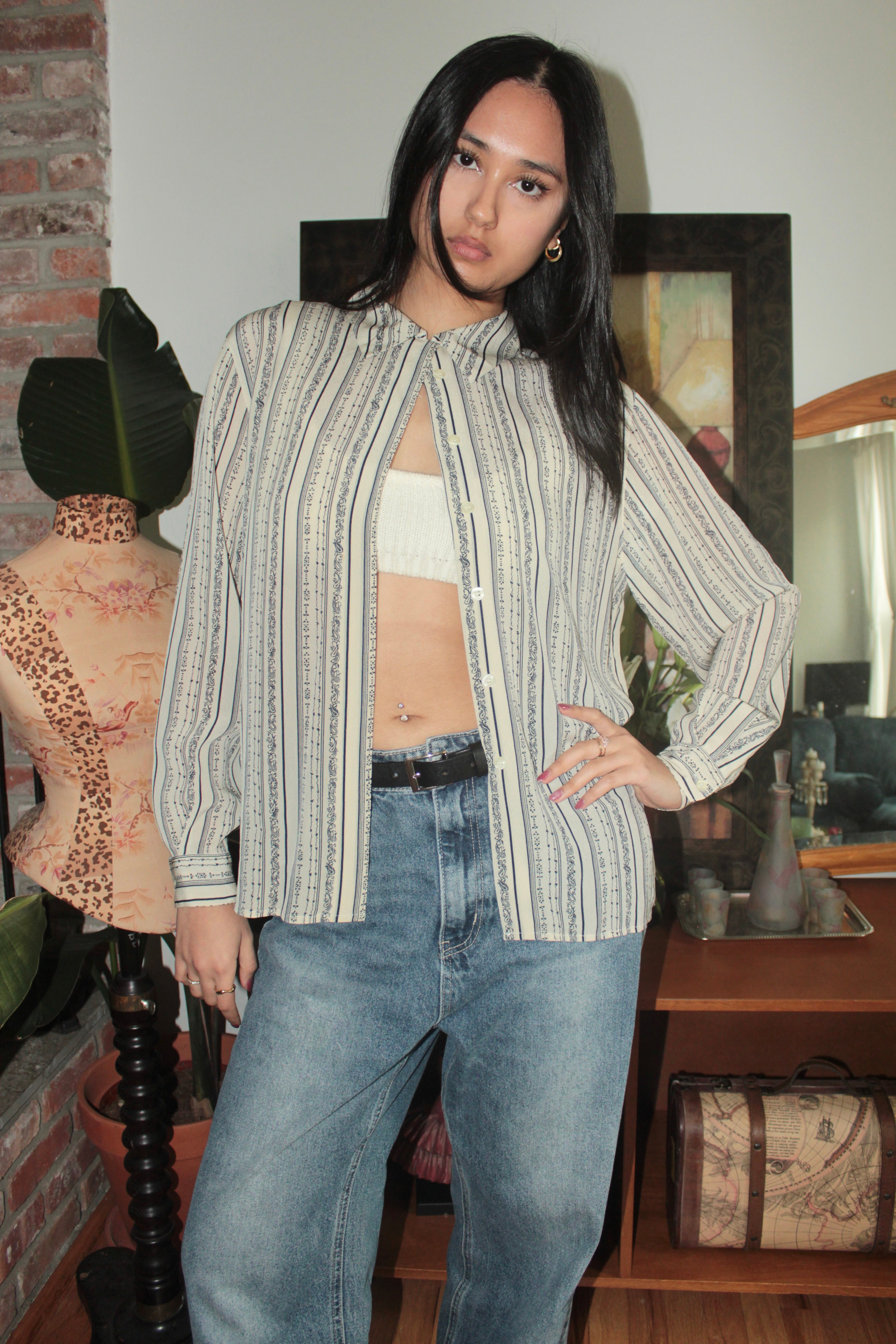 Vintage Cream & Blue Floral Striped Blouse (M)