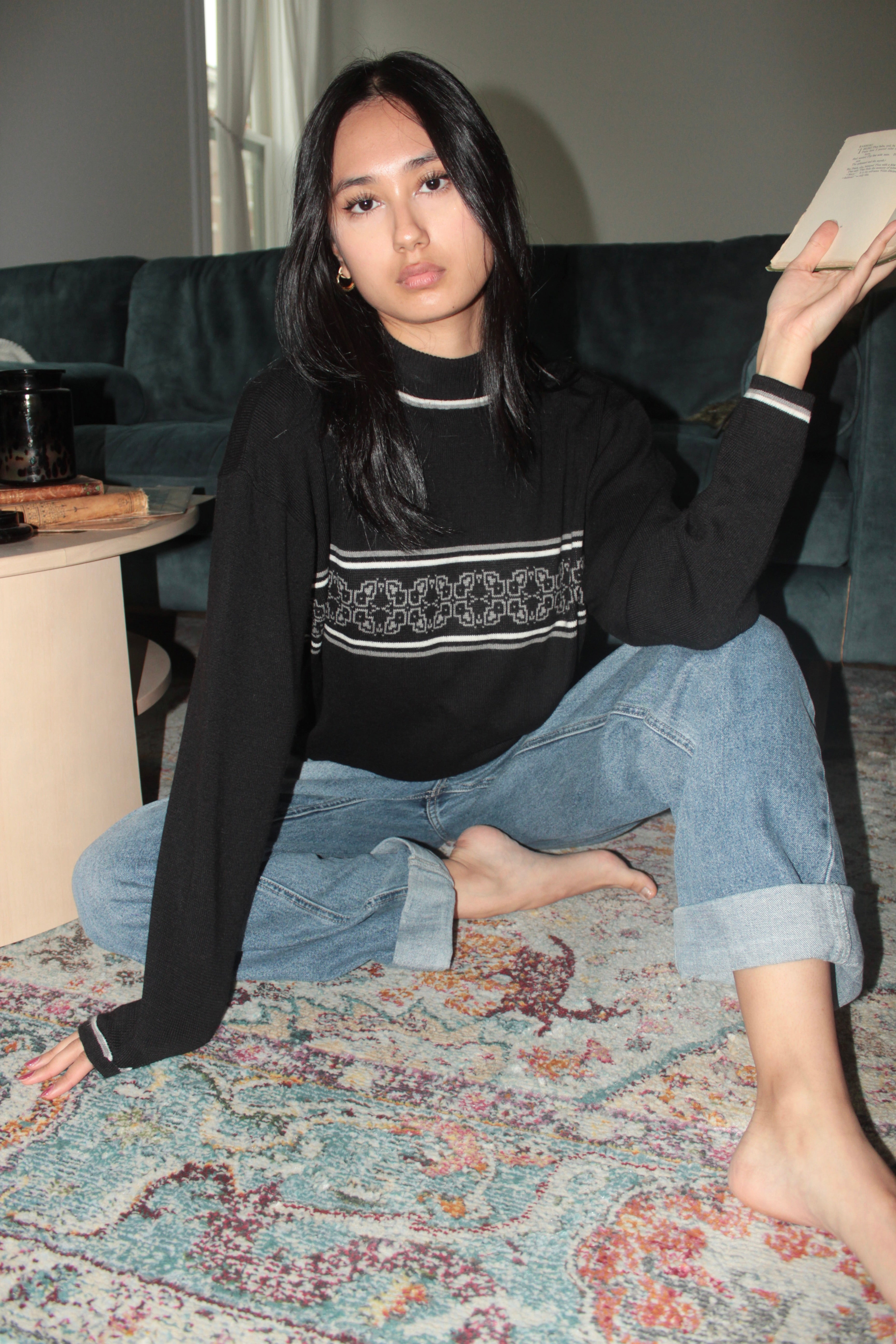 Vintage 90s Black Ribbed Turtleneck With Contrast Stripe (S)