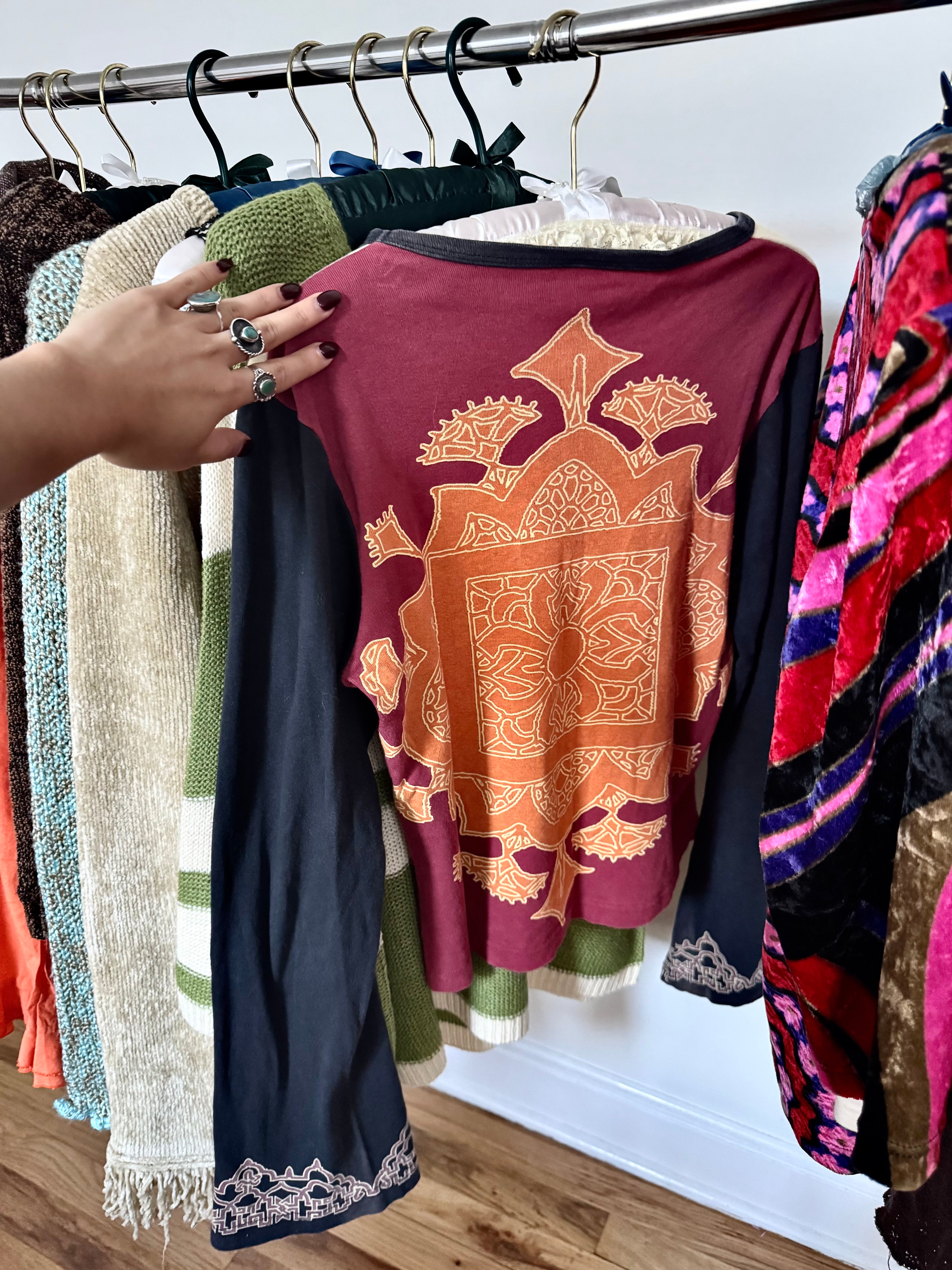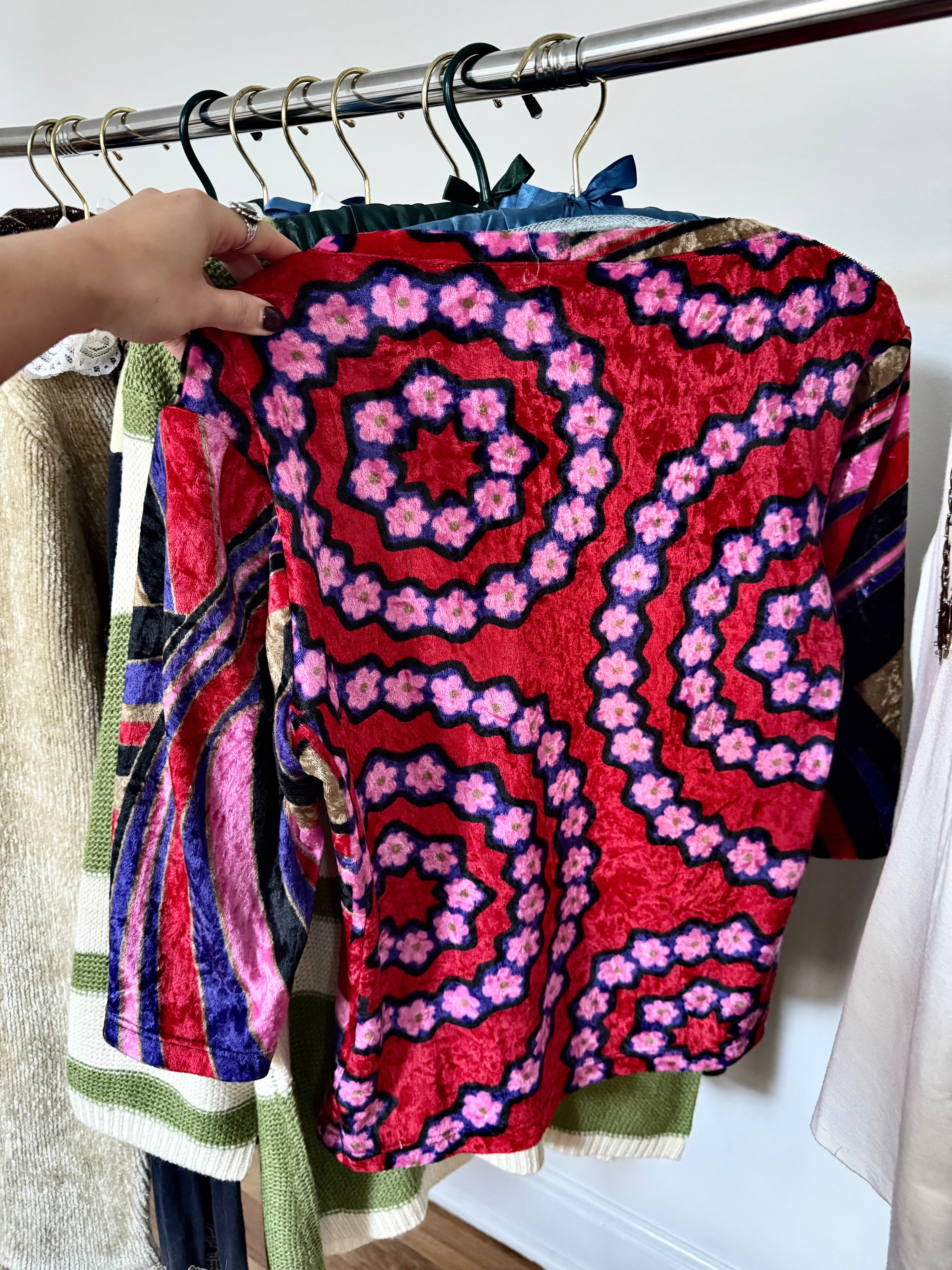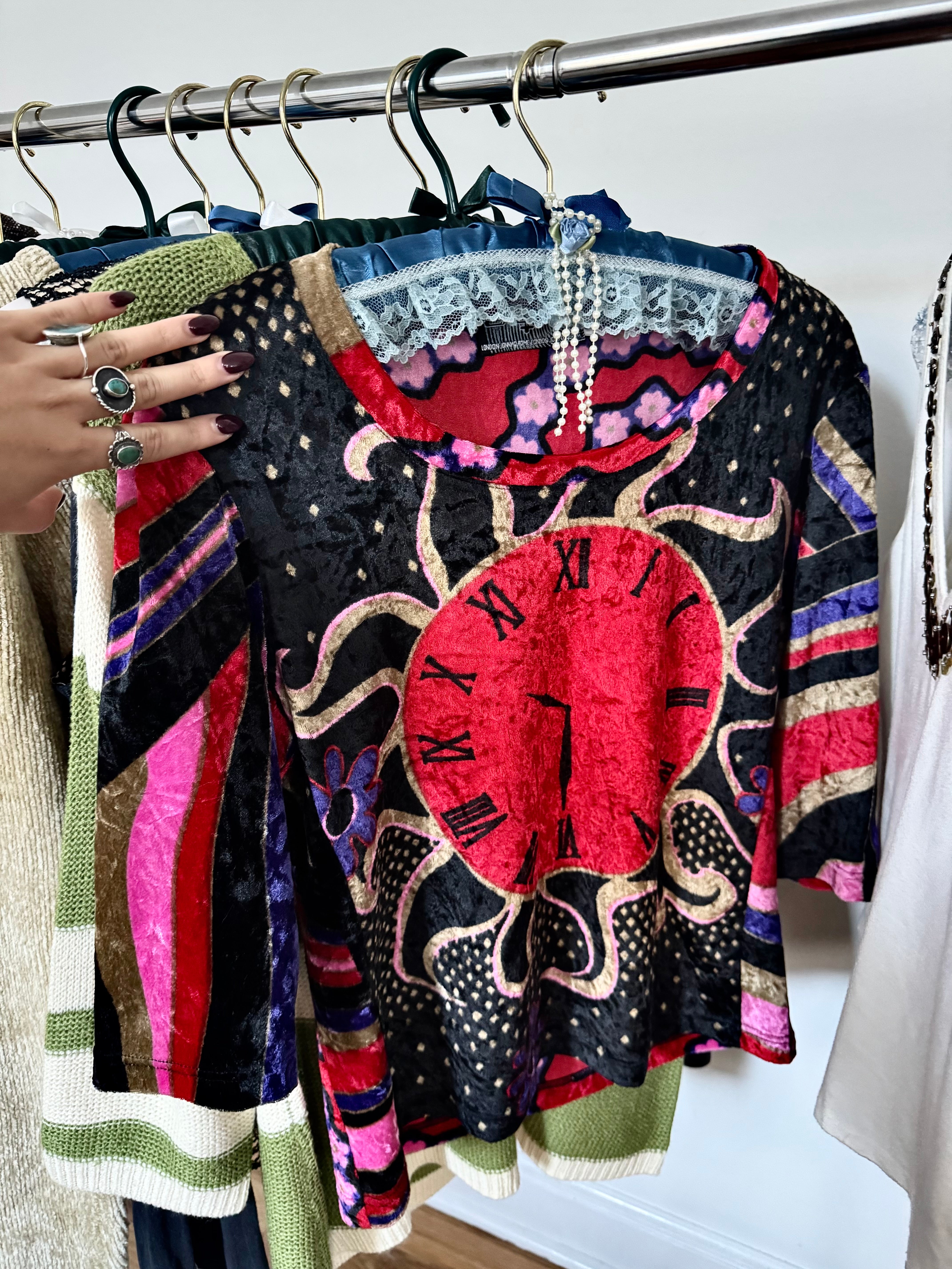 Vintage 90s Velvet Clock Patchwork Graphic Knit Top - Sourced in Germany (M)