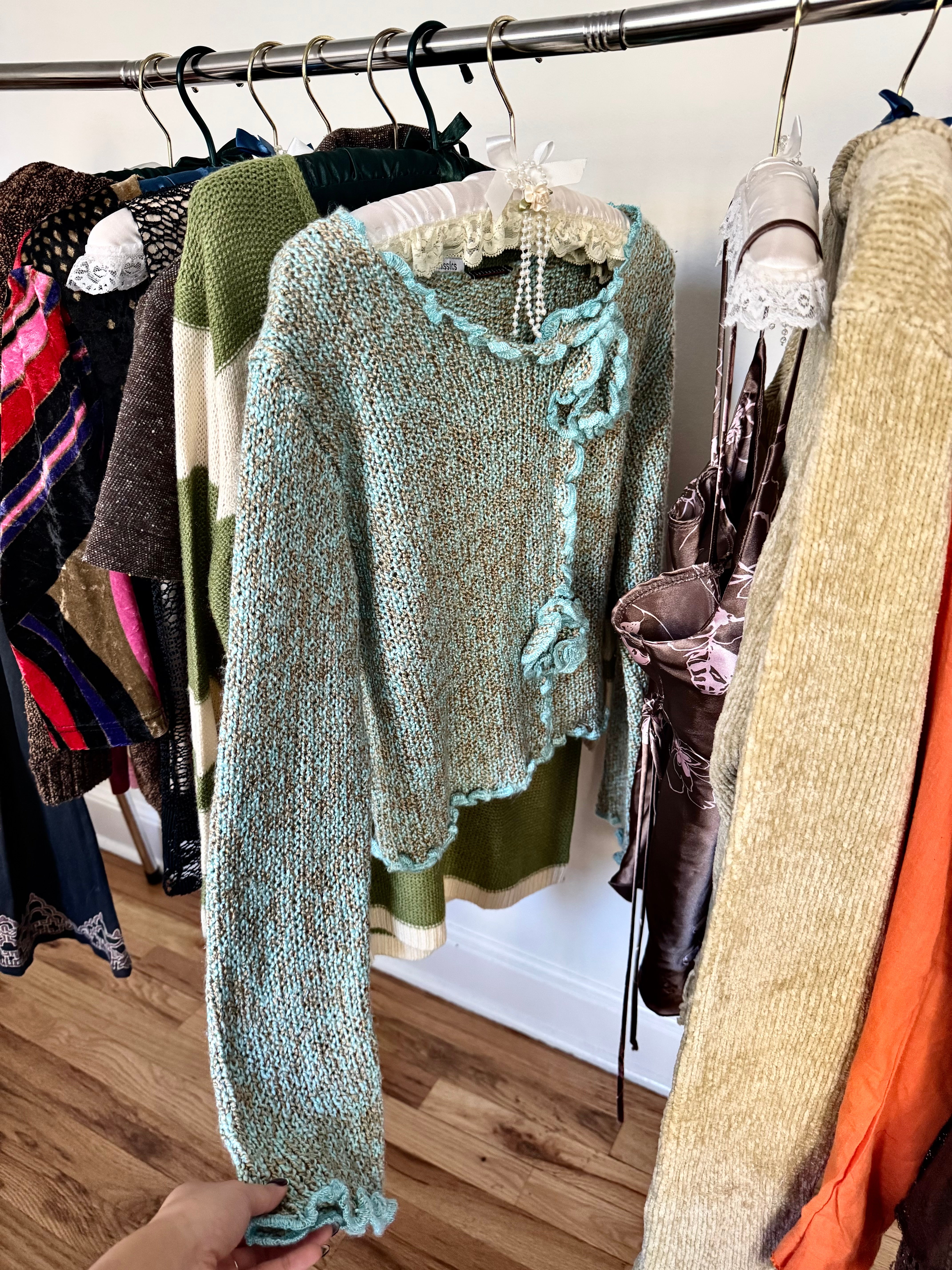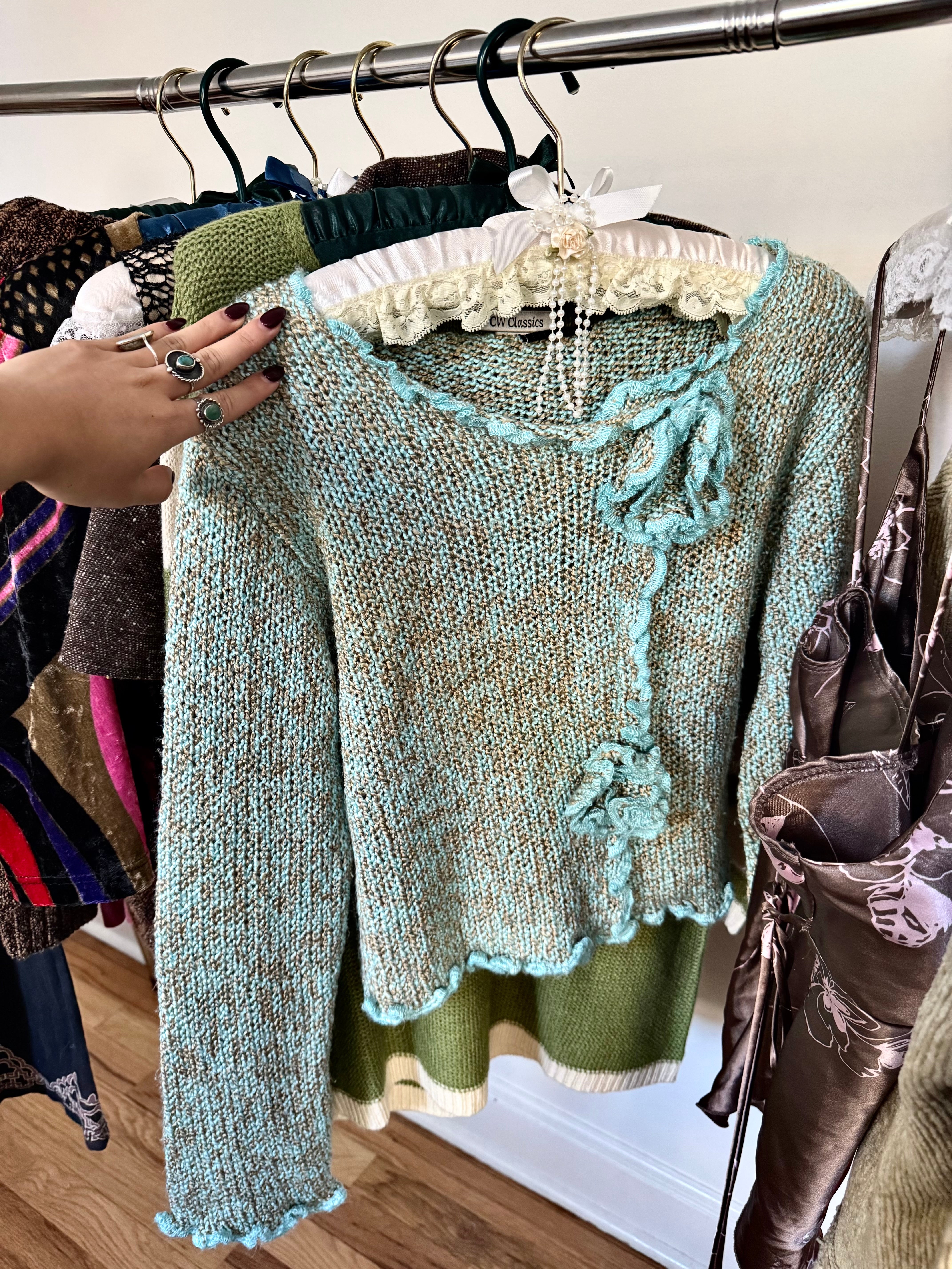 Vintage 90s Delicate Floral Ruffled Aqua Knit- Sourced in Paris (S)