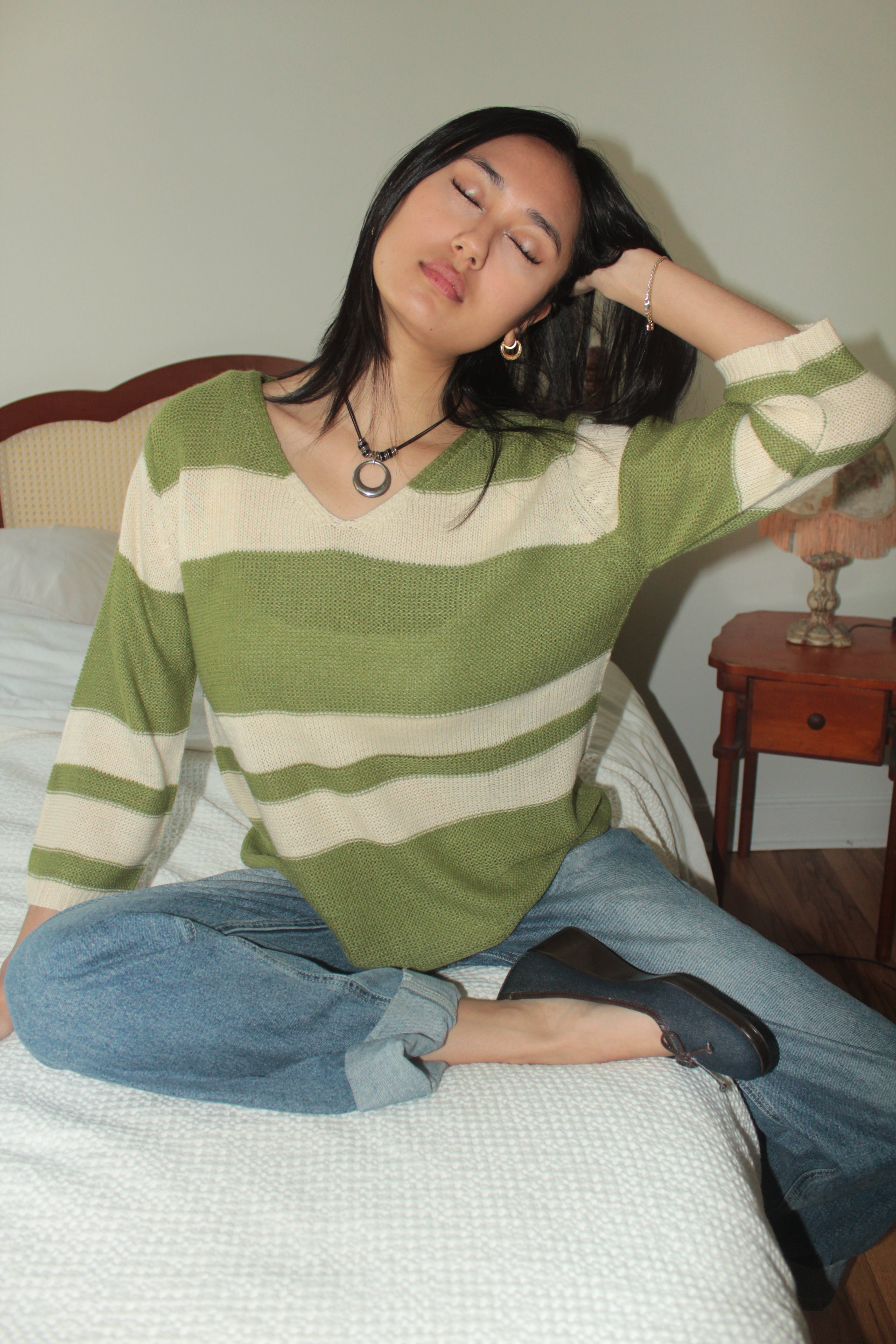 Vintage 90s Olive & Cream Stripe Knit Top (M)